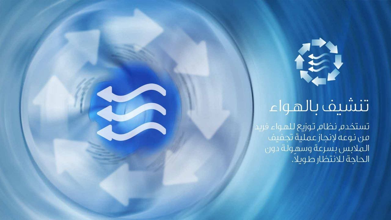 التنشيف بالهواء – عند دوران الحوض للتنشيف، فان تقنية التجفيف بالهواء تدعم مداورة الهواء من الداخل والخارج لتسهيل وتسريع عملية التنشيف