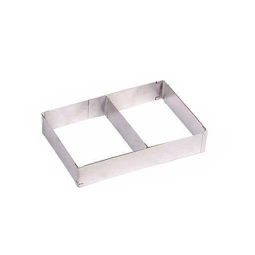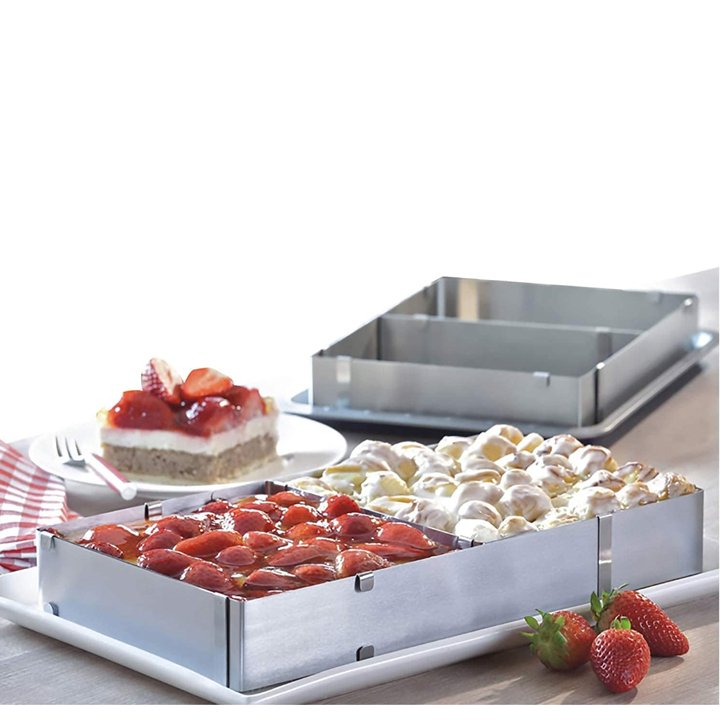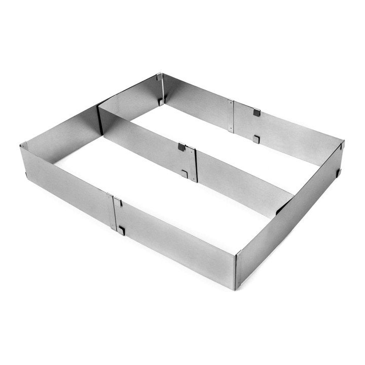 قالب كيك قابل للتعديل من ماركة كروف، تصميم عملي مصنوع من الستيل المقاوم للصدأ قابل للتصغير والتكبير بسمك 0.5 ملم وبارتفاع 5 سم القياس عند التكبير 53×34.5 سم القياس عند التصغير 27.5×18.5 سم
